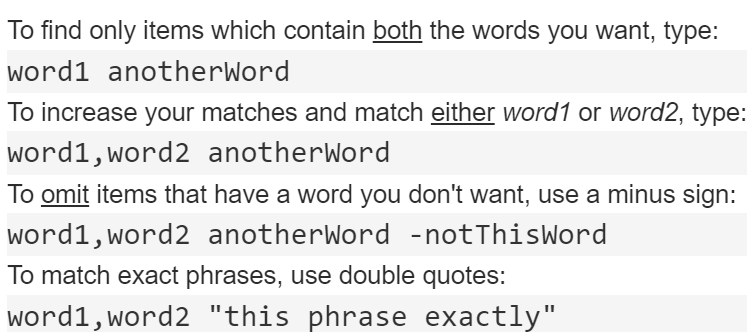 When using SetSee for the first time, it is useful to type a little more slowly than you normally do, so you see how the filtering happens continuously as you add (or remove) each character in your query. Also, try using the BACKSPACE key, the ESC key, or adding junk letters like zx to any word in your search query (the page will shrink to nothing, as you will have no matches). Hover your mouse over the Help link in the SetSee panel to understand the search rules that give you the power of Boolean operations (e.g., how to find either word1 or word2 by just using a comma):