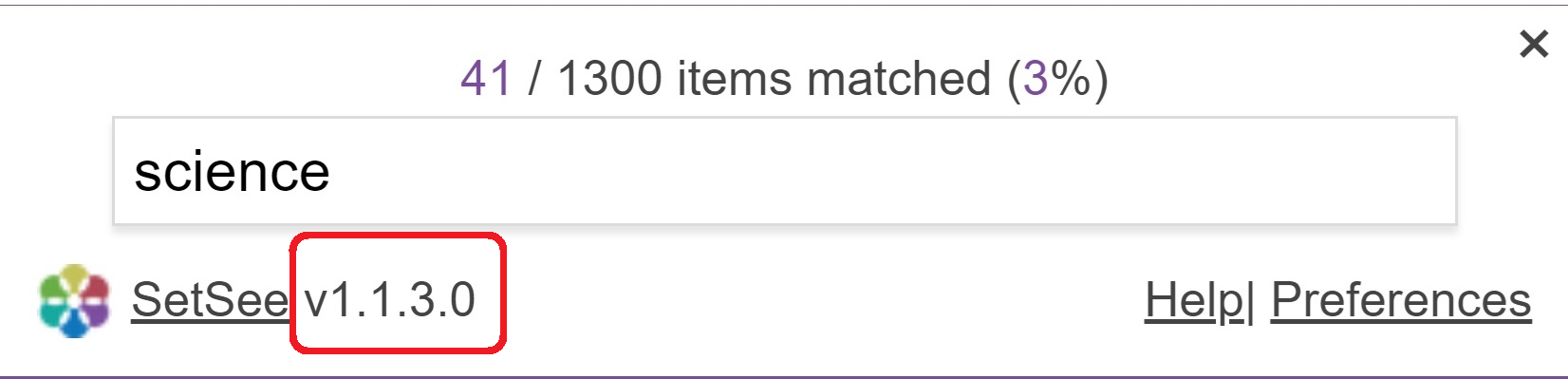 A:    The latest version is v1.1.3.0, released in Nov 2023.  The version of SetSee you are using is shown in the bottom left corner of the SetSee panel when it is open (the panel is at the bottom right of the browser window):