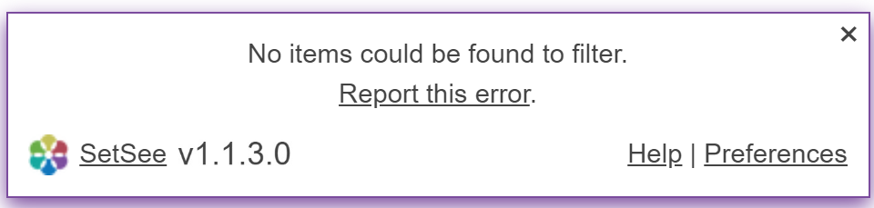 Q:  SetSee is showing me an error that says “No items could be found to filter.”