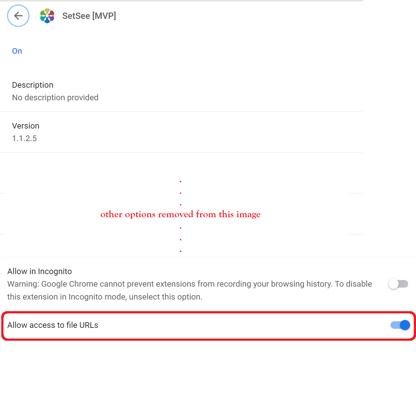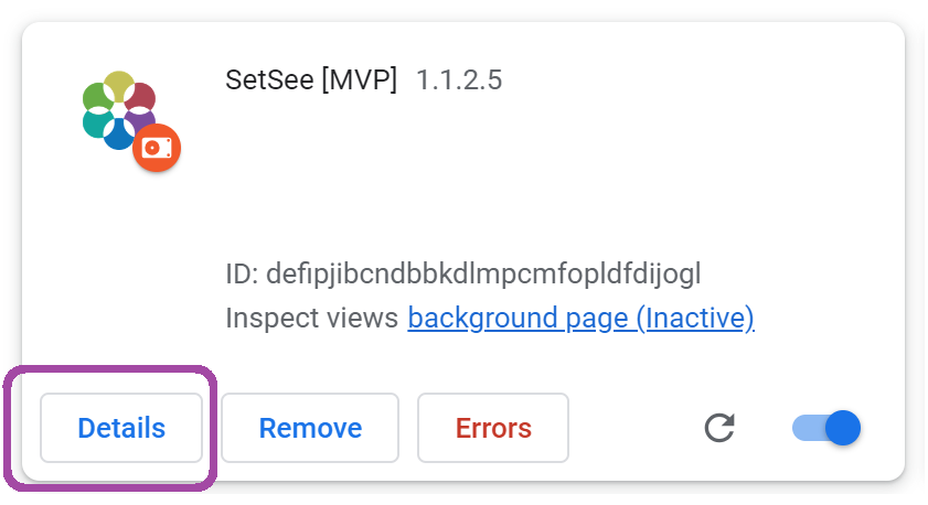 However, when a browser opens a local file system directory, it typically renders it in HTML (with a DOM) and so SetSee works on that.  But for this to work, you need to change an option in Chrome for the SetSee extension.  To do so, open the Chrome extensions page at chrome://extensions, and in the box for the SetSee extension, click on the Details button: