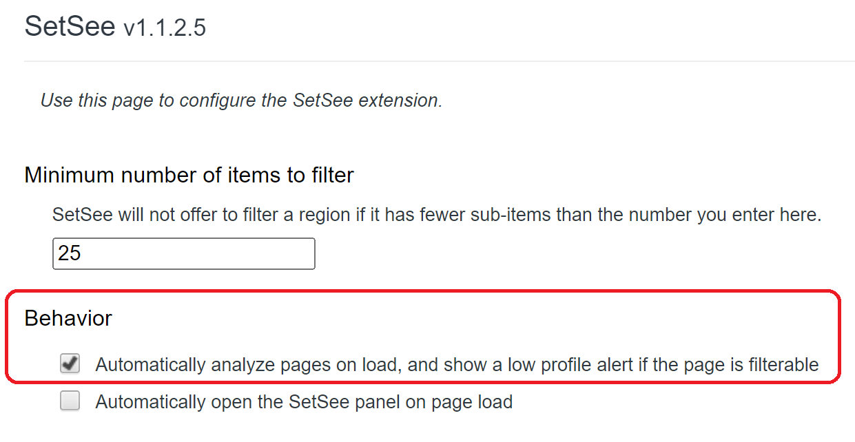 Note, however, that the lower the value that you set this number to, the more issues you may have with how SetSee behaves.  Since SetSee is designed to filter long content, we have to decide on a working definition of long content—and we have decided on 25 items (of repetitive content).  When you set this lower, the current algorithm may identify, as regions, parts of the page that cannot meaningfully be filtered.  So though we let you lower this value, caution is in order.  And if you lower it below 10, you will surely run into problems trying to use SetSee.  And if you lower it to 1, don’t complain—just explain to us what value you think there is in filtering a set that only has 1 item in it!  We picked 25 because we felt that most lists or tables or articles of 25 items can be fairly quickly scanned visually, without SetSee, to find what you want.  Maybe setting it to 20, maybe to 15, occasionally to 10, will be useful.  But typically 25 works well for people.