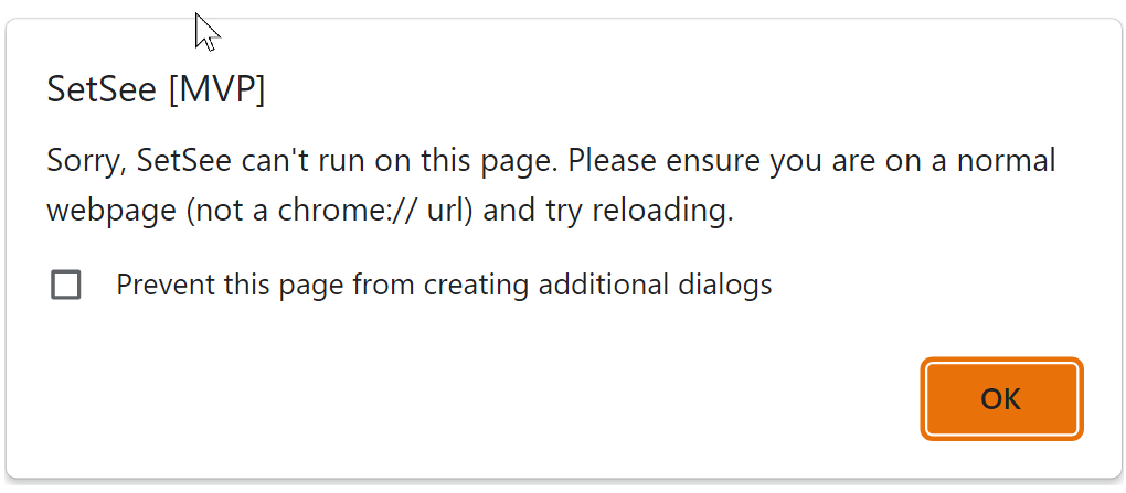 Q:   I get a pop-up error from SetSee that says  Sorry, SetSee can't run on this page. Please ensure you are on a normal web page (not a chrome:// URL) and try reloading the page.