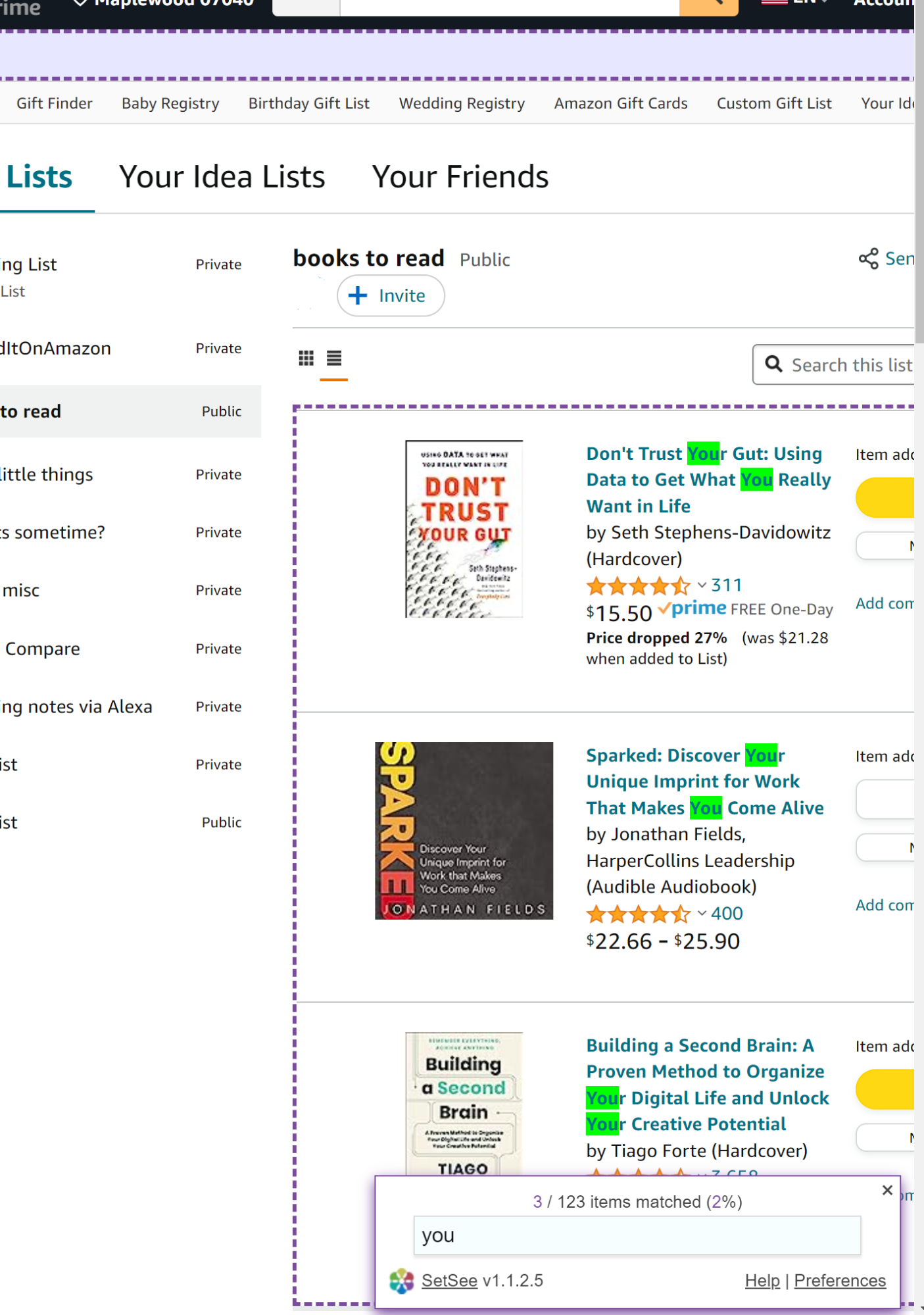 - lists of things you want to consider in the future on Amazon (books to read, gifts to buy, etc):