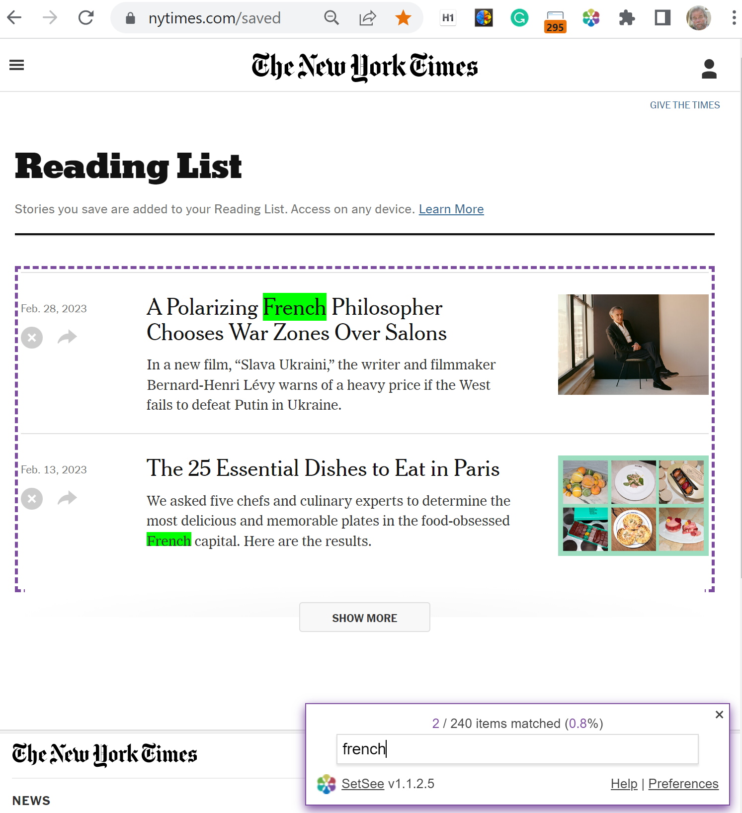Comment: Pages like this one on the NY Times website are about the only pages there that work with SetSee. (You may need to scroll down on this list of Op-Ed articles a few times to cause the infinite scrolling mechanism to kick in and load more items.)