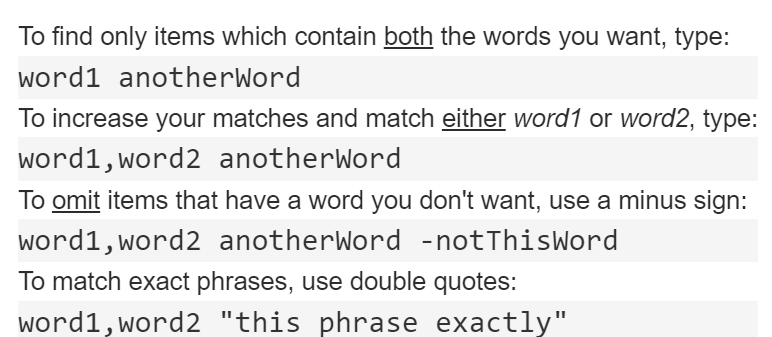 Hold your mouse over the Help link in the lower right of the search panel and these 8 lines of advice on how to write your search terms will ◄ ◄ ◄ |